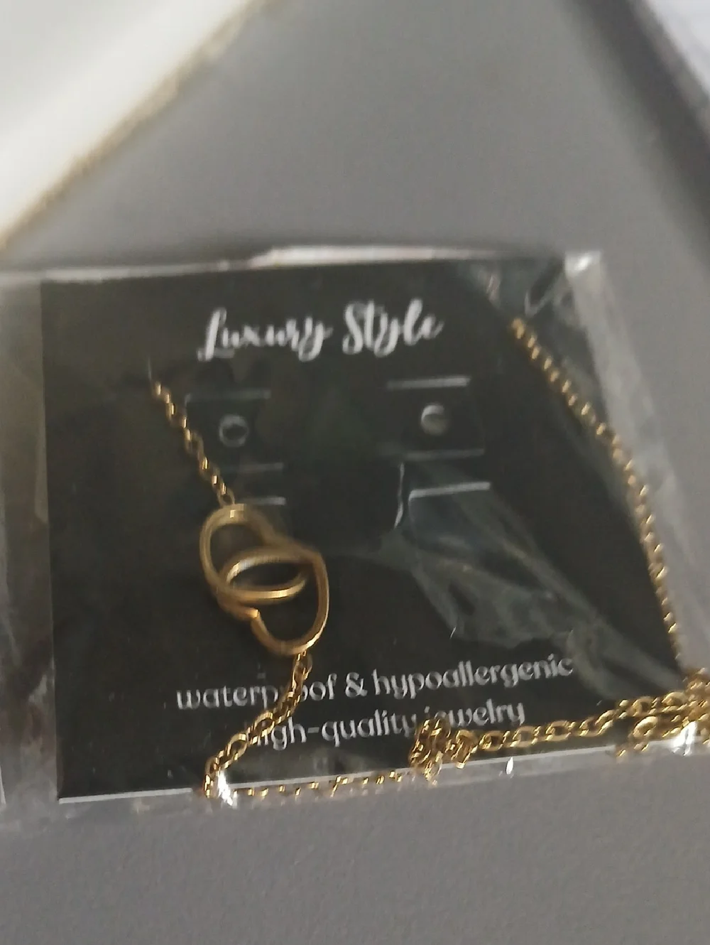 Elegant gold interlocking rings pendant from . Polished gold finish that adds subtle shine. Lightweight chain for comfortable everyday wear. Hypoallergenic for sensitive skin. Perfect to layer or wear solo for a refined look.
