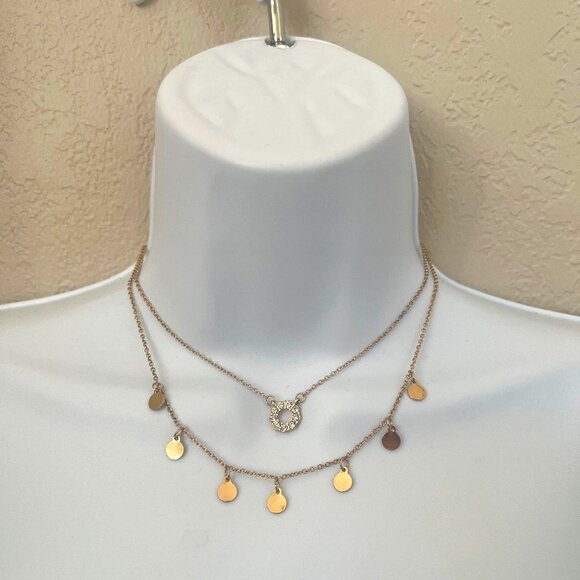 Gold layered chain necklace with jewel charm. 18” longer layer and 16” shorter chain. Originally from Francesca’s, worn only a few times.