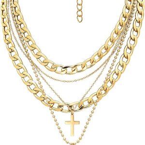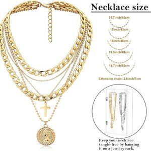 Features: This standout layered necklace features 5 separate chains—a mix of dainty and chunky styles, including retro portrait coin pendants and cross chains. Total length is 18.5 inches with an adjustable extension for a perfect fit. Crafted from durable, polished stainless steel with a shiny gold plating, it's hypoallergenic and safe to wear daily or for special occasions.