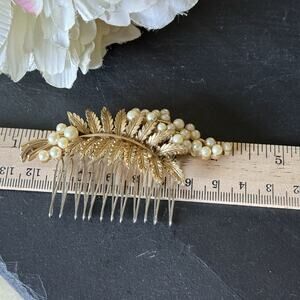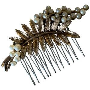 Gold Leaf Pearl Bridal Hair Comb Vintage Wedding Holiday Accessory New Years Eve