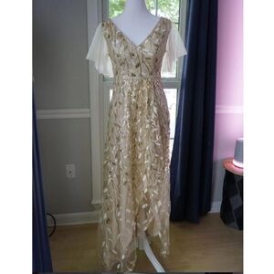 Gold Leaf Sequin Flutter Sleeve Gown. Not sure what the brand is. This gown combines whimsy and sophistication - a truly ethereal piece that catches the light with every movement. The layered tulle adds graceful movement while the fitted bodice and v-neckline offer a flattering silhouette to this full length dress. Features:
