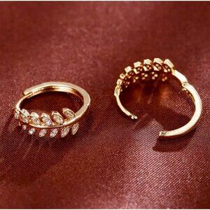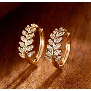 Gold Leaf Sparkle Hoop Earrings These 18k Gold Plated earrings are a nice touch if you like a little something extra. They're shaped like little leaves and have some sparkly stones in them, all set in a gold tone. They're not too big, so they'd work for everyday wear and just add a bit of subtle shine to your look.