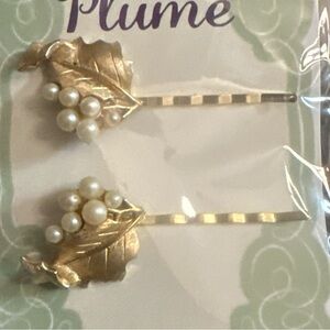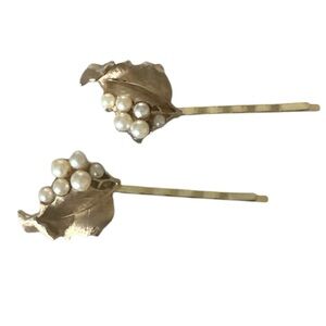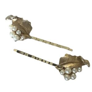 • Set of two hairpins: gold-tone leaves with faux pearl accents