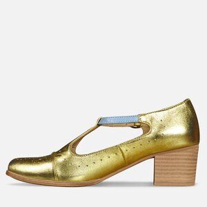 Elevate your style with these stunning heeled Mary Janes in radiant gold leather, accentuated by a charming blue strap and delicate broguing for a touch of whimsy. These shoes exude elegance and sophistication, perfect for adding a glamorous flair to any ensemble.
