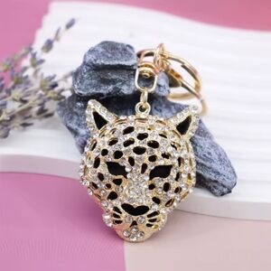 Elegant gold leopard keychain. Sparkling design with intricate details. Perfect accessory for any bag.