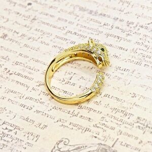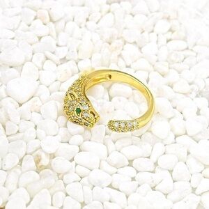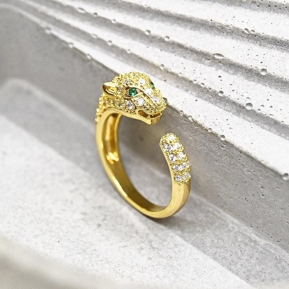 Features a sculpted panther / leopard head with stunning micro pave crystal design and green rhinestones as eyes. Finished on high polished stainless steel hardware!