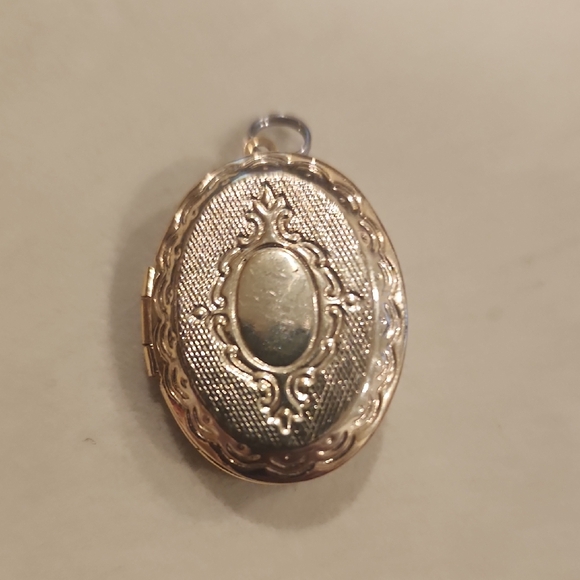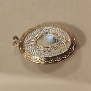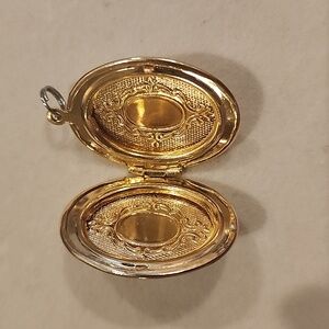 Gold toned locket. Opens and can place images inside. Metal unknown. Slight signs of wear on front.