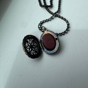 Elegant necklace with a gold locket with included diffuser pad for essential oils. Can be used instead as a locket to hold something personal. Features intricate design on the pendant, and rhinestone 18” chain. Gently used.