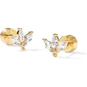 Combine symbolic strength with daintiness in this mini lotus-shaped flat back stud pair. These 14K yellow gold-plated earrings measure 6.5mm x 8mm and feature 2mm x 4mm marquise cubic zirconia and 1.25mm round cubic zirconia stones, all secured with 925 sterling silver posts and screw back closures.