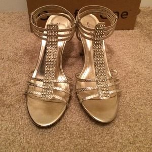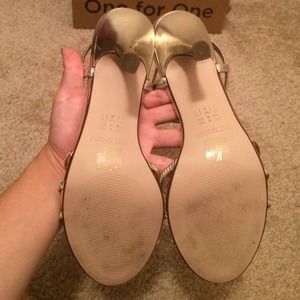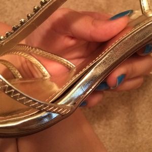 Gold heels. Only worn once. Great for any occasion. Minor opening on right heel. Fixable though.