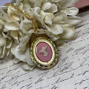 Gold Memorial Jewelry Pink Hummingbird Cameo Locket Necklace Pendant Wedding