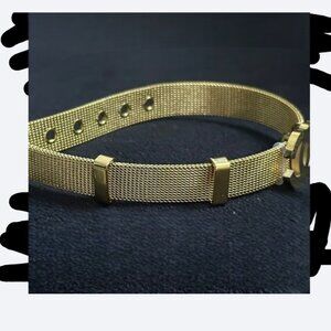 Elegant gold bracelet in the form of a mesh strap. It has a stylish decorative accent. Thanks to the adjustable length, the bracelet fits any hand. The laconic design makes it a universal accessory for everyday style or a festive look.