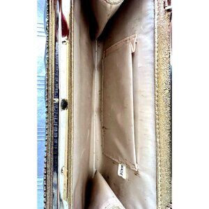 This Gold Metal Mesh Evening Clutch Purse with Rhinestone Crystal Teardrop Accents exudes vintage elegance, making it the perfect accessory for cocktail hours.