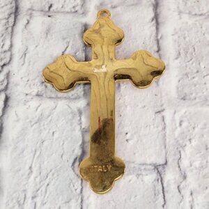 Gold Metal & Red Enamel Crucifix Jesus Wall Figure INRI Inscription 7x4.5" Italy