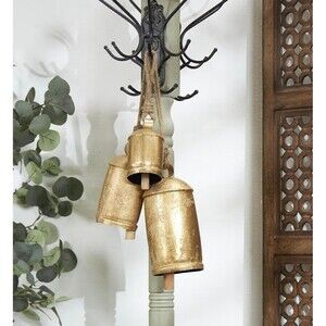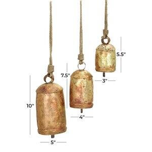 Deco 79 Gold Metal Tibetan Inspired Decorative Giant XL Cow Bells with Jute Hanging Rope, Set of 3 10",8",6"H - Cylindrical