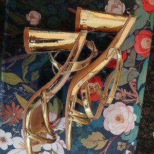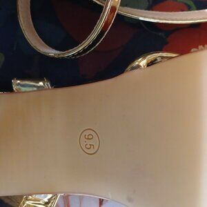 Two strap, adjustable ankle strap sandals. Four inch chunky heels. Square toes. Both heels have very small dings. Photo 5