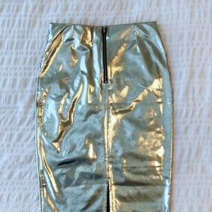 A never-worn gold metallic bodycon skirt that hits right above the knees. It has an accessory zipper as well as a small stylish slit in the back.