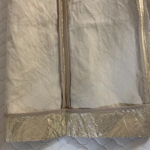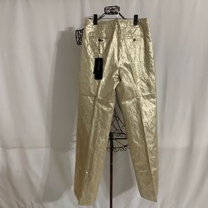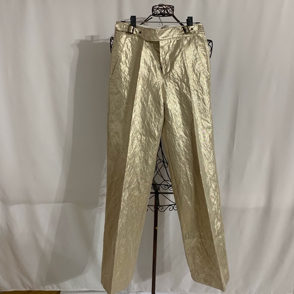 Pants are amazing! They are a medium weight gold metallic fabric! Button fly front. 1 3/4" waistband with buckle detail that allows for waist adjustment! Flat measurement is 34". Side slant front pockets; welt pockets at hip. Back legs have a seam up the center for a great fit. Straight wide leg - 24" at bottom. Flat back measurement 8" below waistband is 21" at back and 19 3/"4 front. Tags say size 6 but I think more like a size 8.