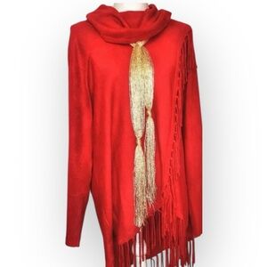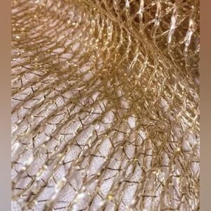 Beautiful high fashion ladies scarf in a true metallic gold mesh with fringe adorning each end of the scarf. This scarf is an all season scarf and has many possibilities for use. This scarf can be worn as a head scarf, a headband, a wrap bracelet or a fashion belt.