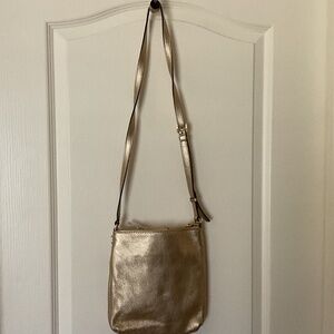 Beautiful Gold Michael Kors shoulder strap bag with key chain that is removable. This bag has never been used but has 3 small places where the gold has rubbed off. I think you could use some leather or teeshirt paint in gold and just touch it up with the end of a toothpick. The blemishes show up in the last 2 pictures. I was going to try the paint but thought it might look like I was trying to hide them. The strap has seven holes so you can adjust the length of the strap. This bag is so stylish and will go with anything!