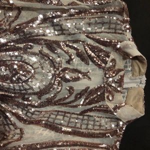 Hello:))This is a brand new gold dress. For those of you worrying if it’s see through it’s not. Underneath the dress comes another layer of clothing hiding anything. This dress is a size large but runs a little small.
