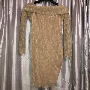 Off the shoulder Mini gold dress PLT size US 6. Never worn. You can adjust the length of the dress with the strings in the side.
