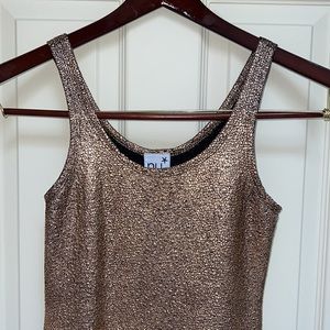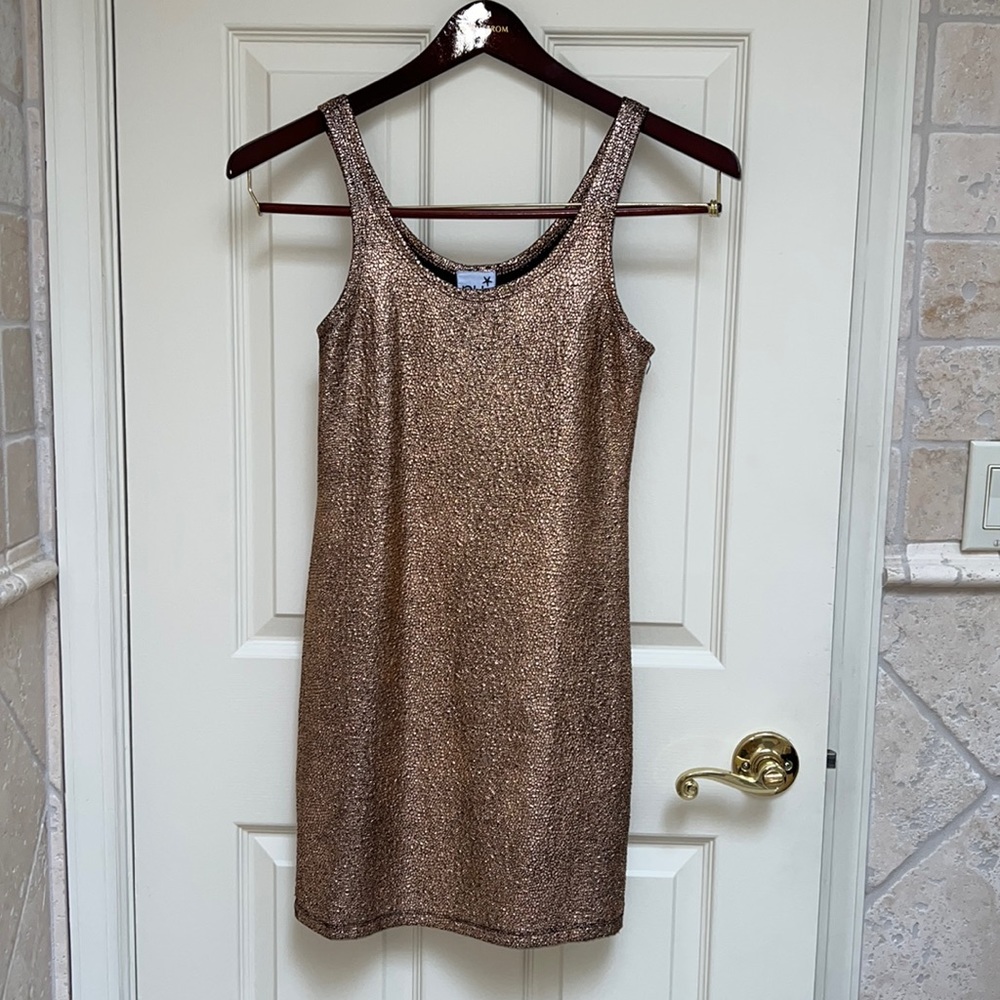 Form fitting shiny gold print mini dress with some stretch. Fits like a size small/extra small. Great preowned condition!
