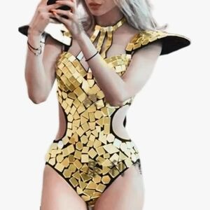 Mirror Bodysuit Women Dance Costume Gold Silver Sequins Fly Shoulder Hollow Out Rave Outfit Stage Clothes Show (gold, M size)
