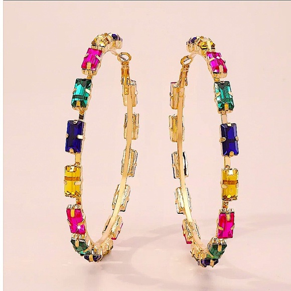 Exaggerated gold gemstones hoop luxury crystal earrings.