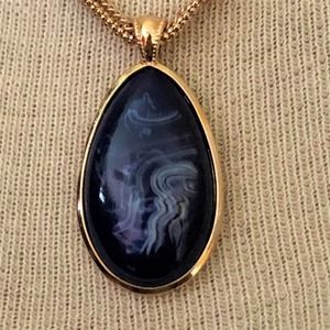 Necklace contains 3 gold strands with an adjustable claw clasp. Pendant measures 1.8" and is blue with white marbling.