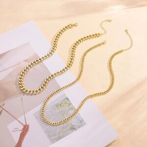 Layered Necklace Set Size::8MM 16.5"+2" cubic link necklace and 5MM 18''+2" cubic link necklace. Simple and stylish chunky gold necklace can be worn alone or layered
