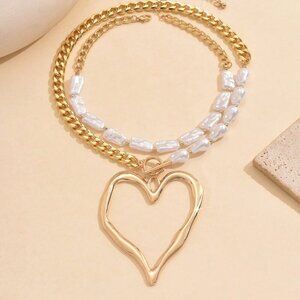 Gold Old Money Style Women's Exaggerated Metal Heart & Asymmetrical Faux Pearl N
