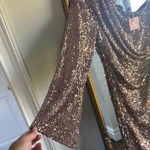 This stunning gold dress features a chic one-shoulder design, perfect for making a statement at any special occasion. The shimmering fabric catches the light beautifully, adding a touch of glamour to your look. Its elegant silhouette ensures a flattering fit, making it a must-have for your wardrobe.