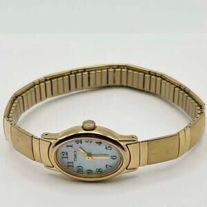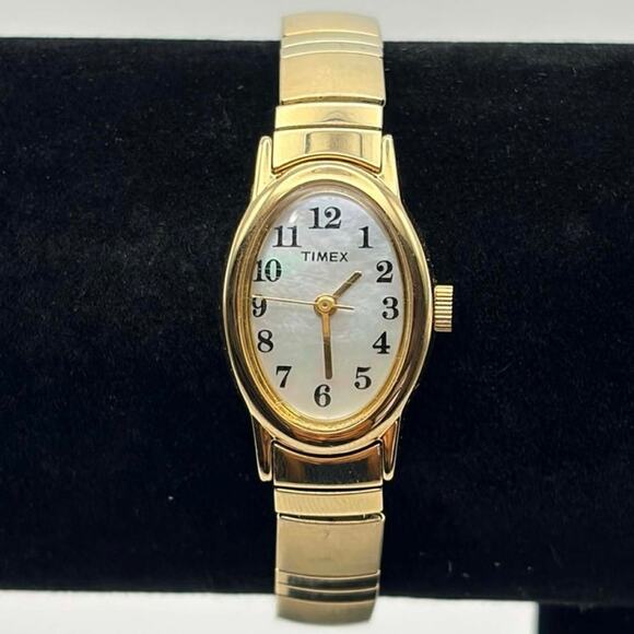 Gold Oval Timex Watch. Fully functional with brand new batteries. Features a Stunning mother-of-pearl watch face. The adjustable metal band fits 6 1/2 in wrist or near.
