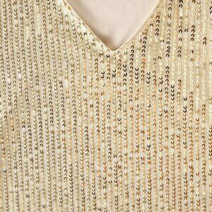 The gold sequin tank top features a V-neck design and is perfect for party occasions. It has a regular fit and length, and is sleeveless for a stylish look.