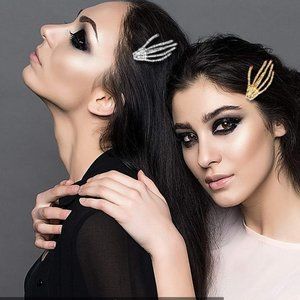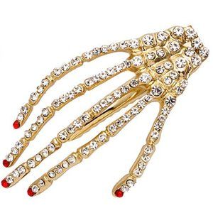 Gold Pave Goth Glam Rhinestone Red Fingernails Skeleton Hand Hair Clip New