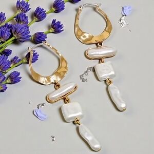 Faux pearl statement earrings | 18K gold plated earrings | stainless steel post earrings | boho chic dangle earrings | hammered teardrop earrings | baroque style pearl drops | wedding guest jewelry | lightweight statement earrings | bridal earrings