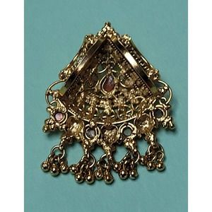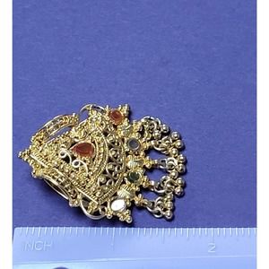 This bright gold pendant has colorful glass rhinestones that sparkle and shine.