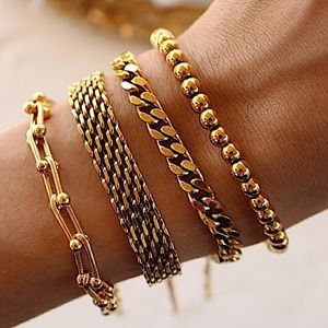 Gold plated 18K stamped set of four bracelet bundle. U link, mesh, Cuban and beaded. Please choose your size when checking out.