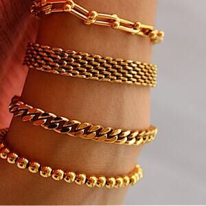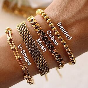 Gold plated 18K stamped set of four bracelet bundle. U link, mesh, Cuban and beaded. Please choose your size when checking out.