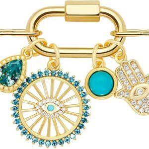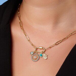 Features: Stylish paperclip chain featuring charms like an Evil Eye coin, Hamsa, turquoise, and CZ teardrop. Always a conversation starter, perfect for adding a layered or standout look. The secure lobster clasp makes it easy to wear all day.