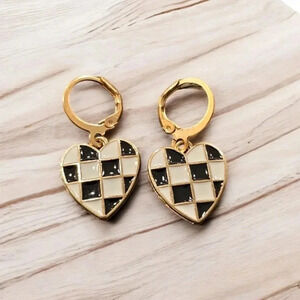 Gold Plated Checkered Acrylic Heart Dangle Clamp Earrings