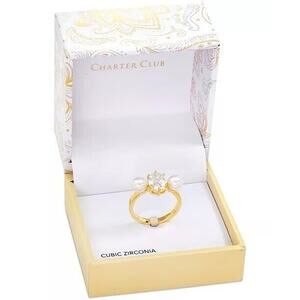 Imitation pearls flank a sparkling crystal on this stunning triple-stone ring from Charter Club.