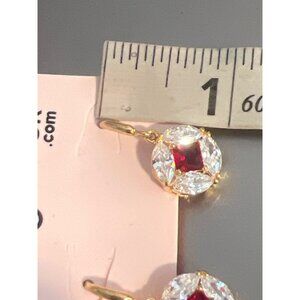 Gold Plated EdgeLook Ruby Red Clear Crystal Drop Earrings Hooks New on Card 1"