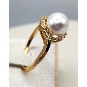 Gold Plated Faux Pearl Ring With Crystal Accent- Solitaire