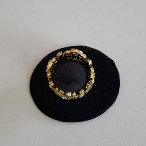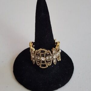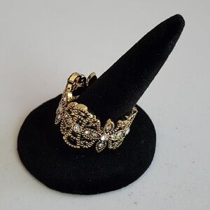 Eye-catching gold tone ring, designed to elevate any ensemble. It features an intricate floral pattern adorned with sparkling rhinestones. Ideal for adding a touch of glamour to evening events, cocktail parties, or special occasions, this ring is sure to turn heads and make a statement.