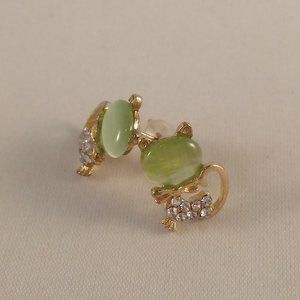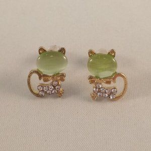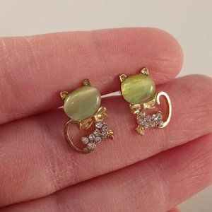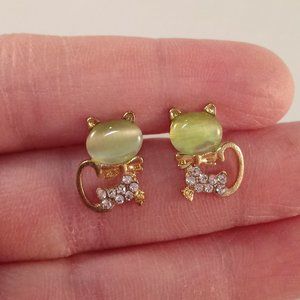 Beautifully crafted classic design crystal cat stud earrings yellow gold plated with sparkling green opal + small round simulated diamond crystal stones. Polished shine, brand new, never been worn. Lead, nickel free. These earrings sparkle.