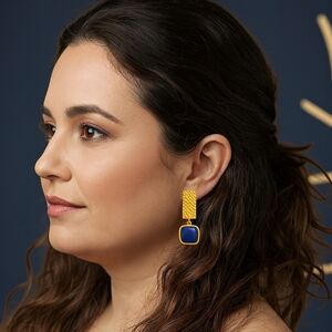 Elevate your style with these stunning geometric drop earrings featuring a gold plated alloy hammered finish and a rich lapis lazuli gemstone. The textured rectangular base adds a unique touch, while the square gemstone dangle provides a pop of color and elegance.