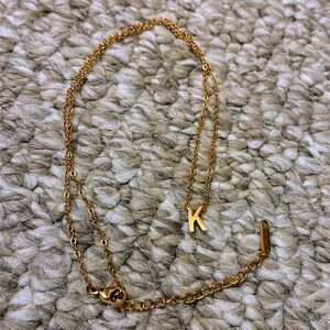Small solid single letter "K" on necklace chain with lobster clasp closure and extension chain. Unable to verify authenticity, but was originally advertised as hypoallergenic 18K real gold plated stainless steel when bought. K necklace 16" not including extra strand at end. Letter "K" approx 0.25" tall . Extra strand at end approx 2.25" long. Tag at end of extension strand reads "K18" on C-link chain. Excellent secondhand condition with no known flaws or defects. From a nonsmoking home.