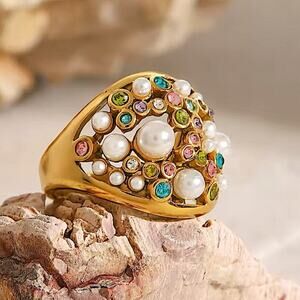 Gold plated stainless steel multicolor zircon and pearl ring. Only have in size 7.
